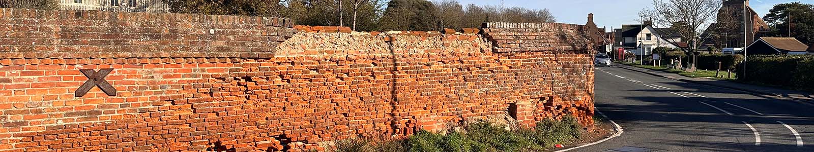 Close up of St Osyth Priory Estate's deteriorating boundary wall